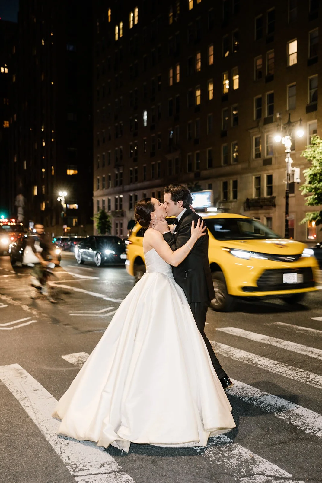 Photographing Rebecca and Kevin in their classic NYC yellow cab on the way to Central Park was one of those quintessential New York moments that never gets old. Tucked into the backseat, still glowing from their ceremony, they soaked in the energy of the city as it buzzed around them—horns honking, pedestrians cheering, and spring sunlight pouring through the windows. Rebecca’s gorgeous ballgown filled the cab with layers of elegance, creating a beautiful contrast against the gritty, fast-paced streets of Manhattan. These in-between moments, candid and joyful, perfectly captured the excitement of just-married bliss and set the tone for their romantic Central Park portraits to come.