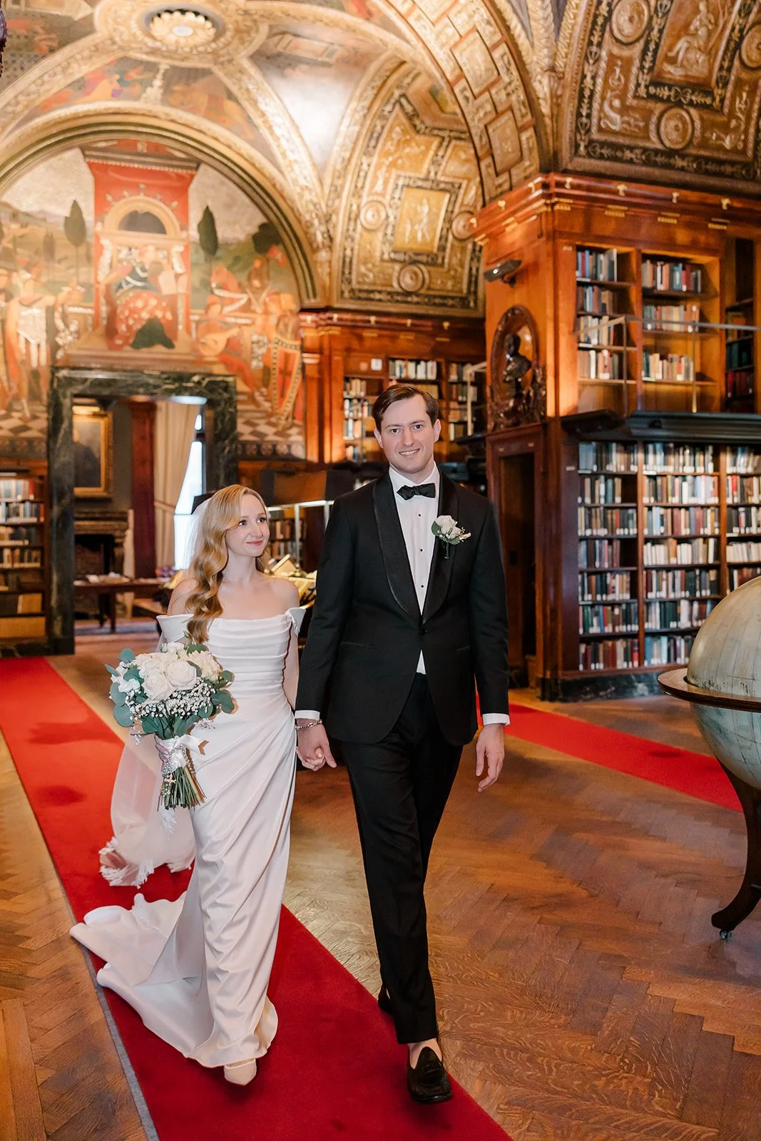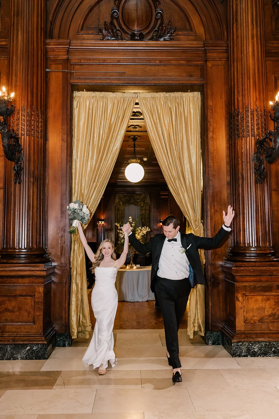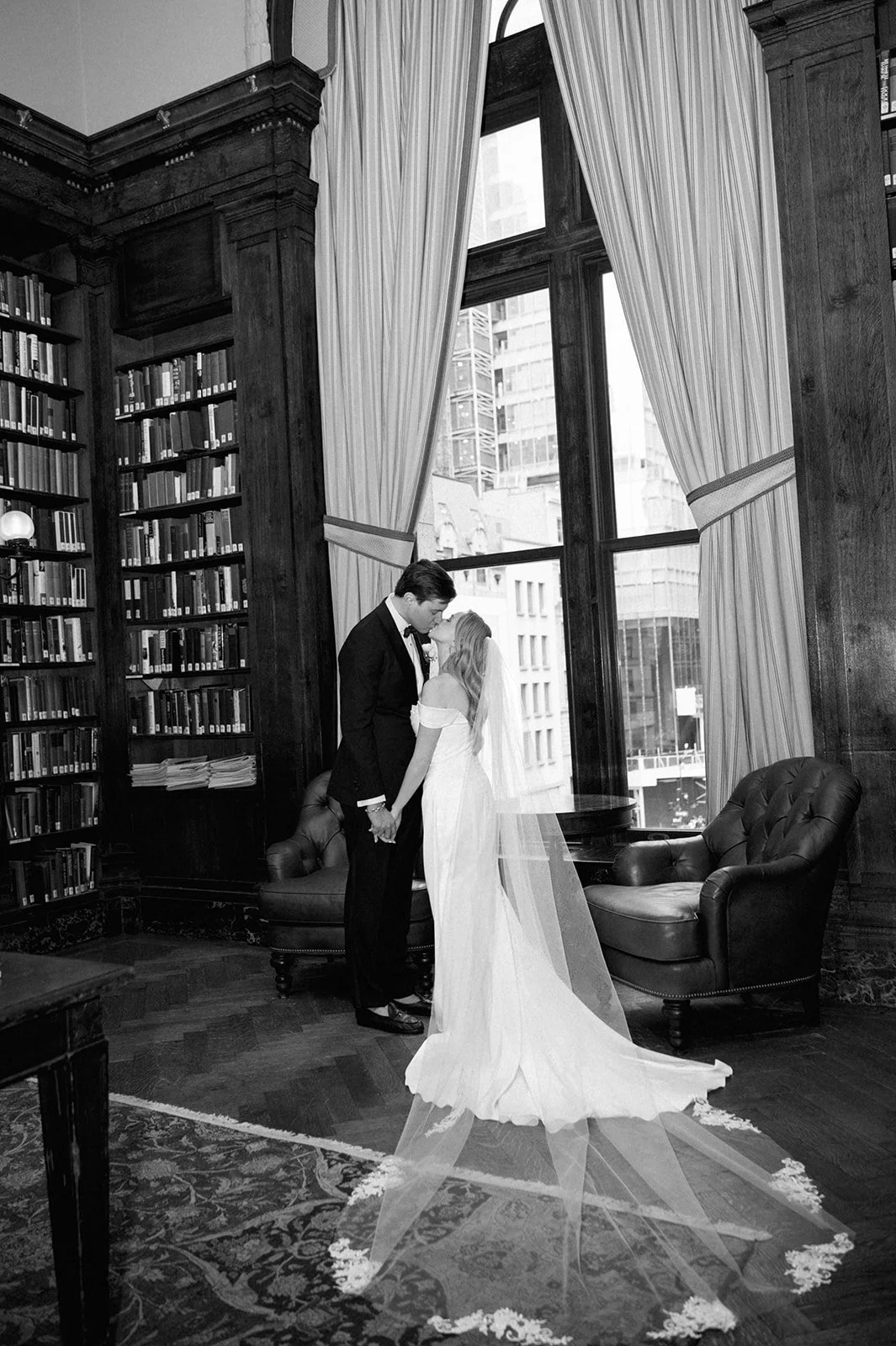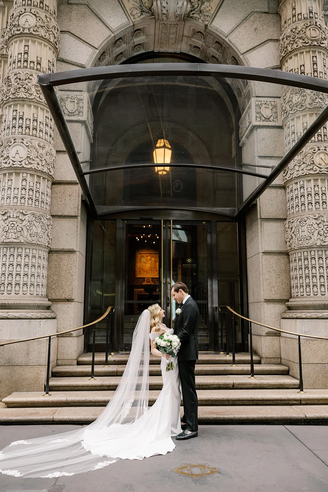 Erin and TJ spent time capturing their wedding portraits throughout the University Club of New York, taking full advantage of the venue’s timeless beauty and historic charm. From the grand staircases to the richly detailed hallways and elegant rooms, each space offered a refined backdrop that felt distinctly New York. The warm wood tones, ornate architectural details, and classic interiors complemented Erin and TJ’s elegant style perfectly, creating portraits that felt both romantic and sophisticated. Wandering through the club together allowed for natural, joyful moments to unfold, resulting in images that reflect not only the grandeur of the setting but also the genuine connection they share.