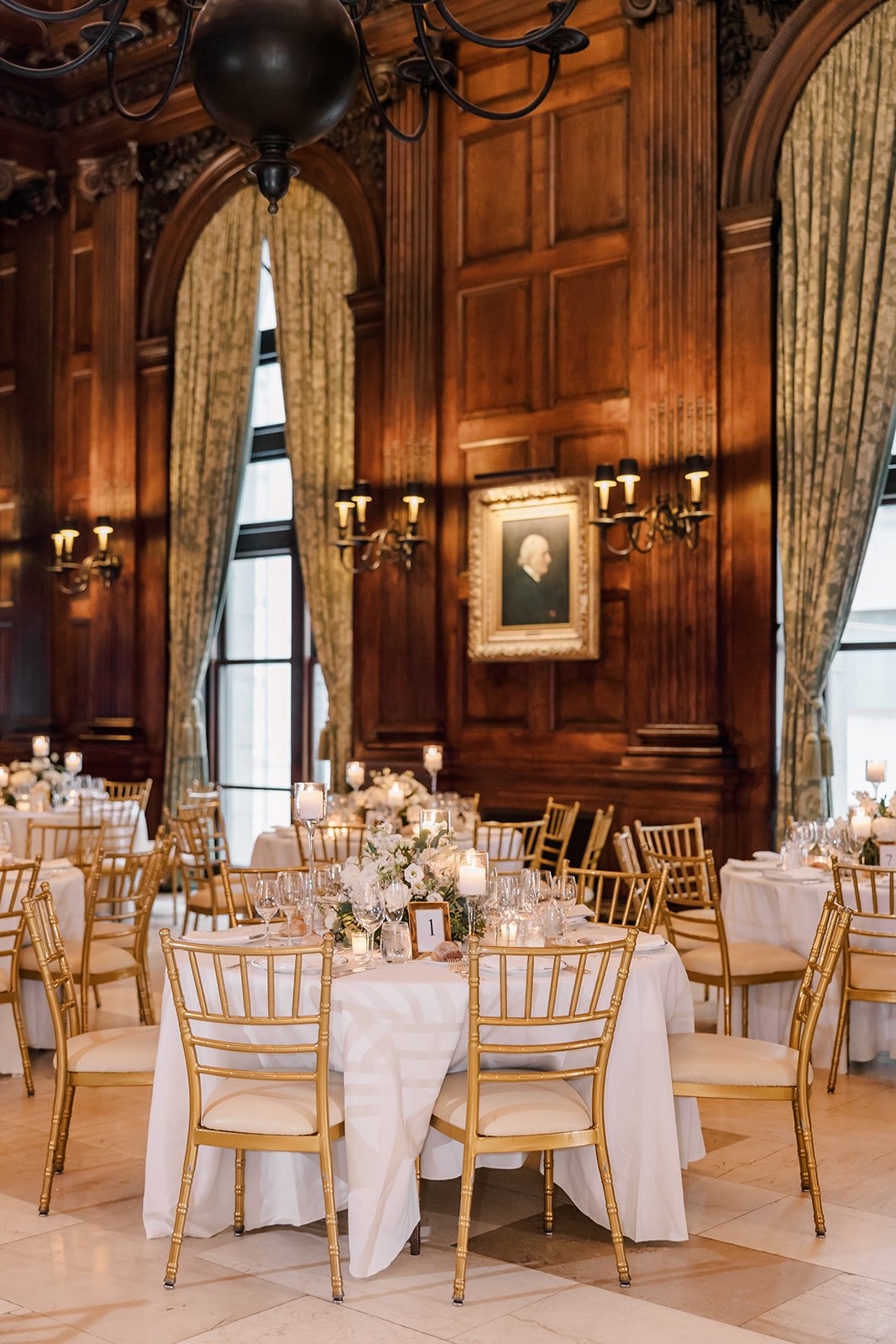 After the heartfelt vows had been exchanged, the celebration continued back at the University Club's stunning reception room, the College Hall. Guests gathered for cocktail hour, enjoying the club’s classic interiors and iconic New York views. The transition into the reception felt seamless, with candlelight, elegant florals, and thoughtfully curated details transforming the space into a warm and inviting celebration. The University Club’s timeless design provided the perfect canvas for Erin and TJ’s vision, sophisticated, romantic, and unmistakably New York.